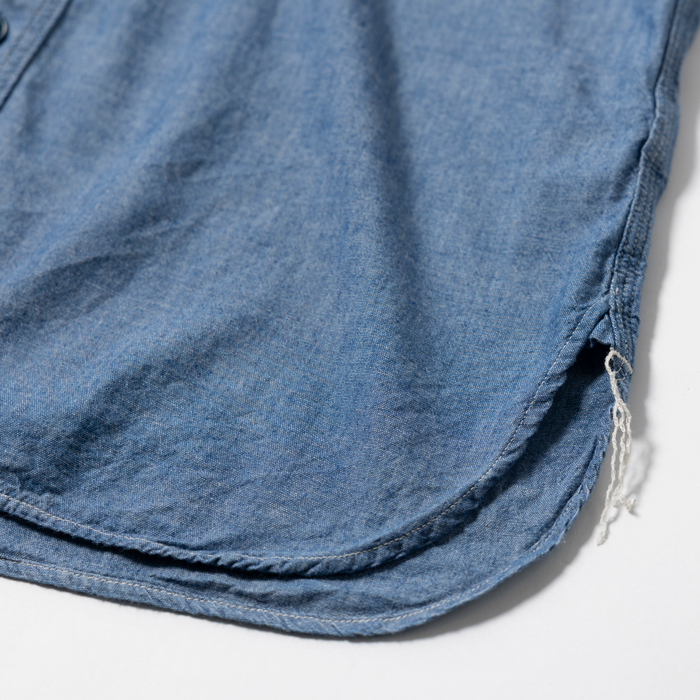 シャンブレーシャツに足し算はいらない。デフォルメがないクラシックなデザインが一番だ。但し、一つ条件がある。経年のヤレ感やダメージがない上質なコンディションを選びたい。とりわけ、襟周りの褪色や黄ばみには注意が必要だ。当該品は『orSlow』がリリースしたシャンブレーシャツで、「US NAVY」のミリタリーシャンブレーを忠実に再現している。上記の条件どおり、ボディや各部に褪色やダメージがない秀逸な個体だ。サイズ「3」で「L」に相当。ミントコンディションだ