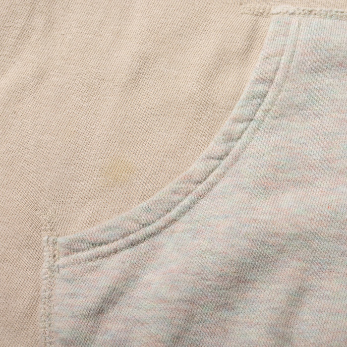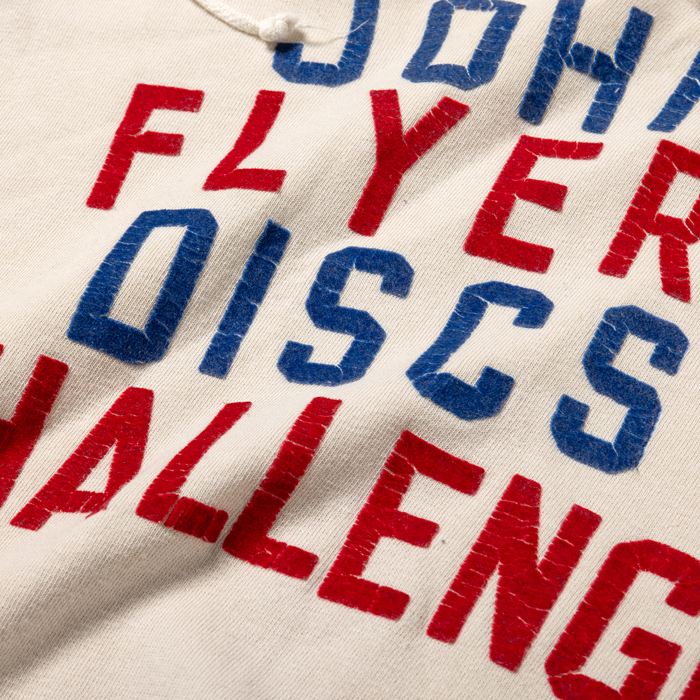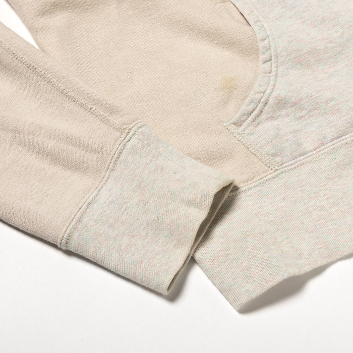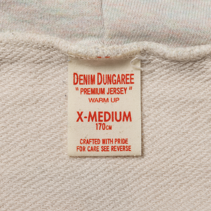 『ヘイルメリーマガジン』及び筆者のインスタから、幾度も露出しているこだわりのフーディーを出品する。当該品は『DENIM DUNGAREE』がリリースしたスウェットパーカで、前後のアメリカンなプリントに惹かれて購入した思い出の一着。ボディはコットン100%のアイボリーで、前面にはフリスビー系のフロッキープリントが星条旗カラーで入っている。後面には、ステンシルペイントがハンドメイドっぽく印字されるこだわりよう。洗い加工でヴィンテージ感あるも、グッドコンディションだ
