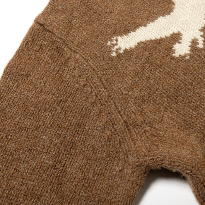 筆者は強く推しているが、ここにきてやっと『BEAMS PLUS』や『J.S. Homestead』の評価が高くなっている。実のところ、インナーやトラウザースはアメカジハイブランドより優れているアイテムが多い。当該品は『BEAMS PLUS』がリリースしたアウトドア系セーターで、ミドルゲージのニットを用いて鳥や森の風景が編み込まれている。ボディは肉厚で、ウール100%なのが嬉しい。落ち着いたブラウンカラーゆえ、ウールパンツ、チノーズ、ジーンズと相性良し。ミントコンディションだ