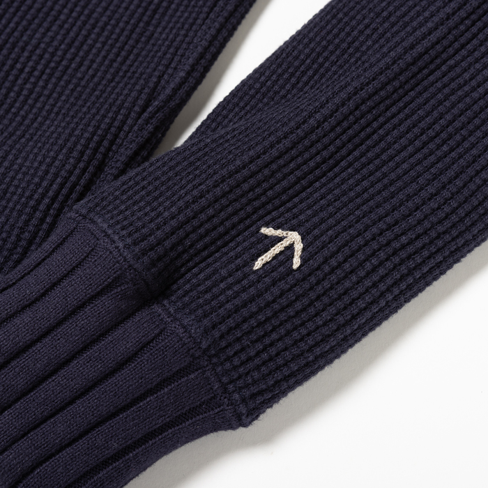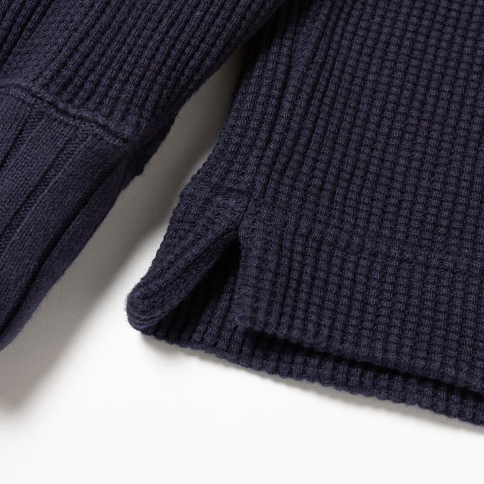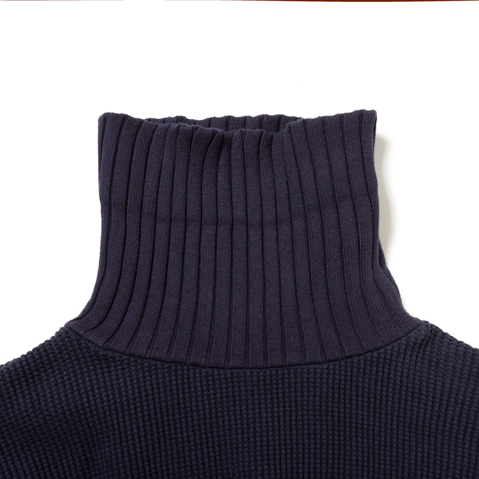 近年、アメカジのワードローブとして俄然注目されているのがカットソーのタートルネックシャツ。それを、ミリタリー系ジャケット或いはアウトドア系ジャケットの下に着用するのだ。カットソーゆえコットン系素材が多いため、着用感が良くコーディネート的にもフィットしてくれる。当該品は、ミリタリー及びアウトドアに強い『Nigel Cabourn』のタートルネックシャツ。当然ナイジェル氏は、そのジャンルをターゲットにしている。カラーはネイビーで、ミントコンディションだ