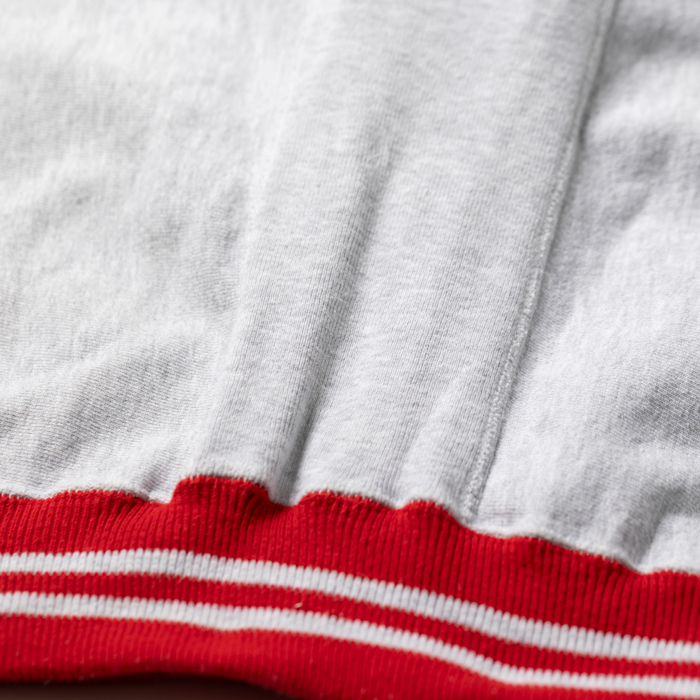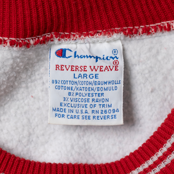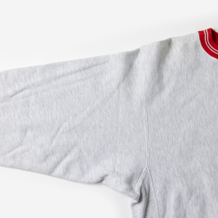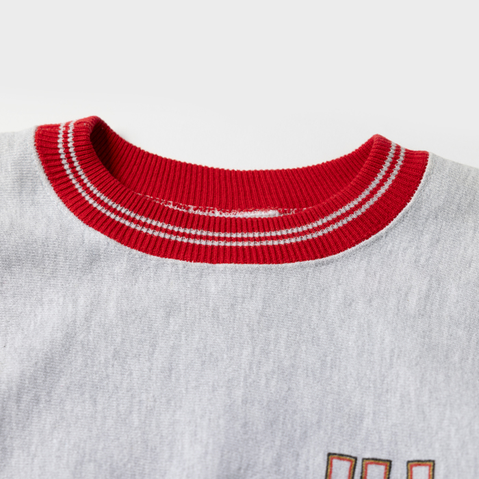 筆者がコレクションしているヴィンテージの『champion』 リバースウィーブを出品しよう。当該品は刺繍のトリコロールタグが付く80年代のヴィンテージピースで、杢グレーボディの各リブにスクールカラーのレッドがセッティングされるスペシャルメイクアップモデルだ。胸には、名門州立大「INDIANA UNIVERSITY」のアイコン& レターが入っている。挿し色でレッドが入るのでジーンズとの相性は抜群だ。着用回数が少ないミントコンディション物ゆえ、貴殿のコレクションに加えて頂きたい