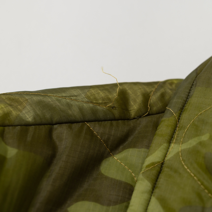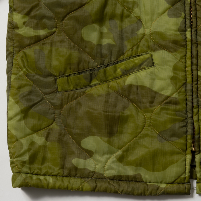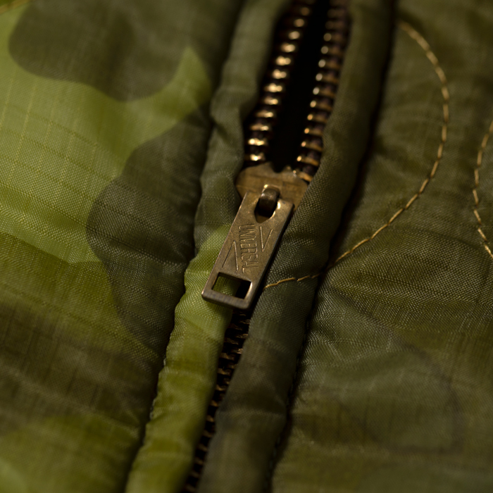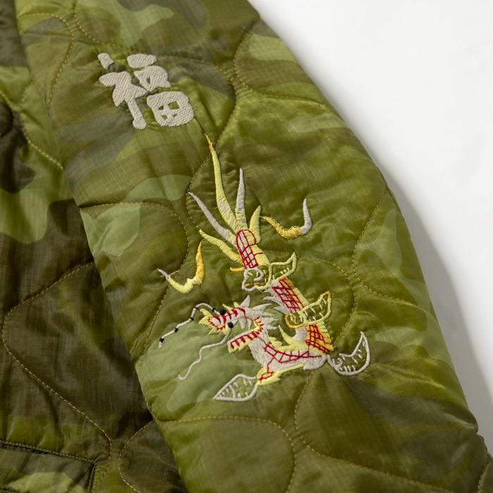 近年、アメカジ上級者に愛用されるようになった東洋の“ベトジャン”を出品する。当該品は東洋エンタープライズの“マニアックライン”『TAILOR TOYO』がリリースしたナイロンキルトのベトジャンで、オリジナルのカムフラージュ柄とベトナム流のヘタウマ刺繍がウリだ。カラフルな刺繍は、前後左右にフルデコ状態で入っている。中綿入りなので、裏ネルのコーチJKTより暖かいのが嬉しい。ボトムスは、ジーンズ或いは軍パン系がフィット。肩に若干ほつれあるがミントコンディションだ