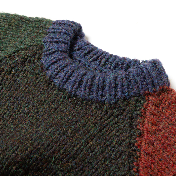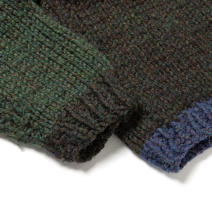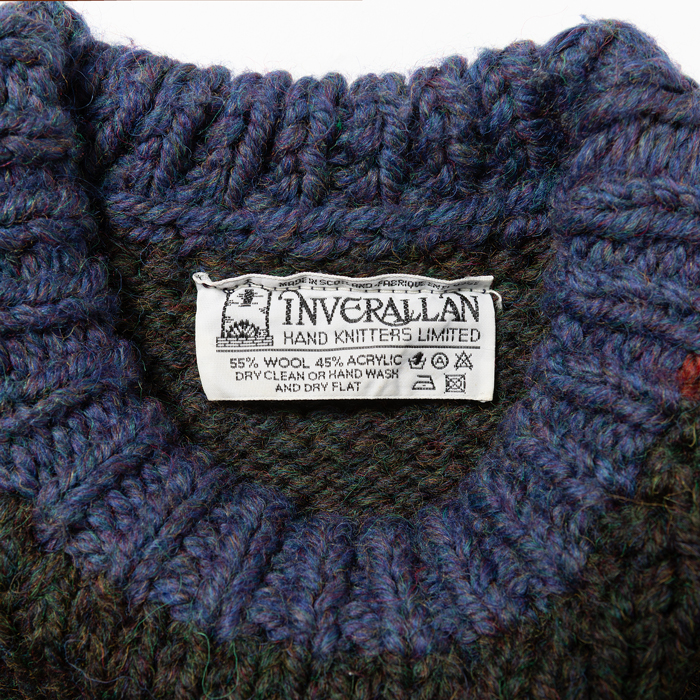 セーターの話をしよう。英国のジェントルマンが着用しそうなカシミヤやラムウールのセーターが苦手だ。筆者はシーメンスが愛用するアランセーターや、フィッシャーマンセーターが好みなのだ。当該品はアランセーターの権化『INVERALLAN』がリリースしたヘビーデューティーな一着で、「MADE IN SCOTLAND」なのが嬉しい。特筆すべきは、グリーン、ダークグリーン、ダークレッド、ブルーの4色を配した渋めのクレイジーパターン。ウール55%アクリル45%でミントコンディションだ