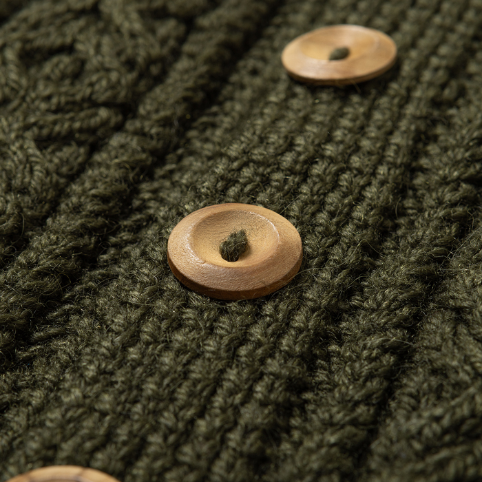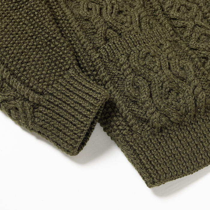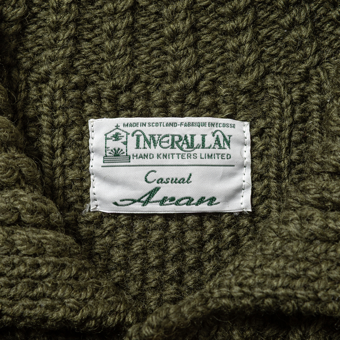 日本人体型に設えられた「MADE IN ENGLAND」のニットウェアを出品しよう。当該品は『Inver Allan』のアランセーターで、日本からのスペシャルオーダーに対応したポロカーディガンだ。着用して実感するところは、細めに変更したアームホールだ。よって、フィッティング良さが愛好家に評価されている。勿論ハンドメイドのウール100%だ。渋めのオリーブグリーンを気に入って購入したが、若干タイトなため手放すことにした。サイズは「M」相当で、コンディションは新品同様だ