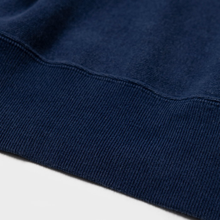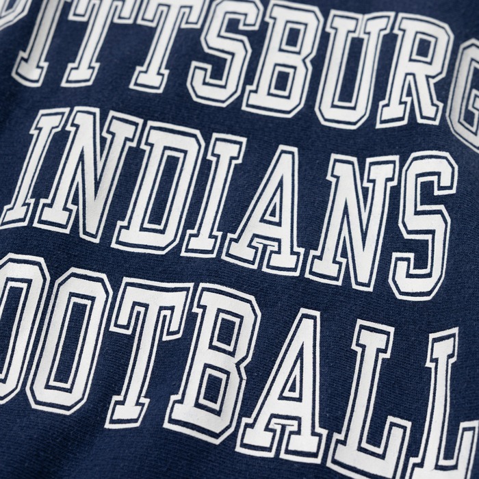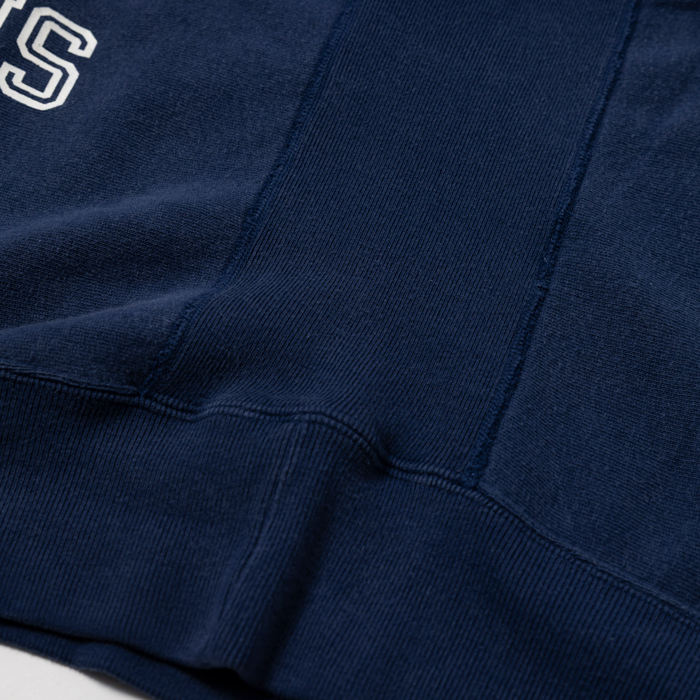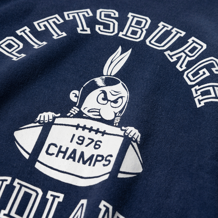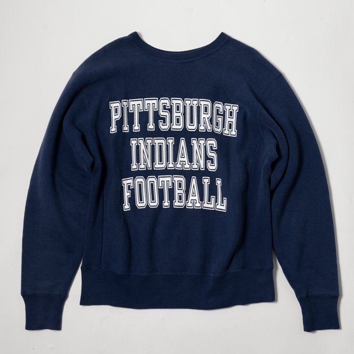 大学1年から『champion』リバースウィーブを愛用して、既に50年という年月が経過している。その経験から申すと、杢グレーとネイビーのクルーネックが最も着用頻度が高い。加えて、お気に入りのプリントだと愛着が増す傾向が強い。当該品は青の単色タグが付く復刻版『champion』リバースウィーブで、上記した❶ネイビーボディ❷クルーネック❸お気に入りプリントと三拍子が揃っている。胸には、インディアンのアイコンとチーム名がプリントされる。グッドコンディションだ