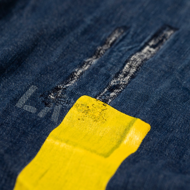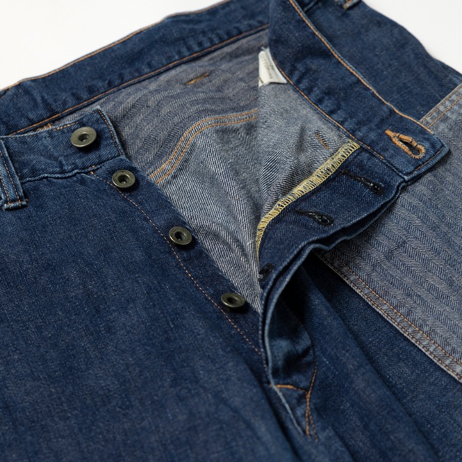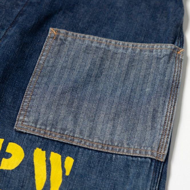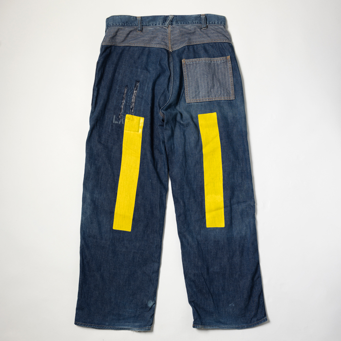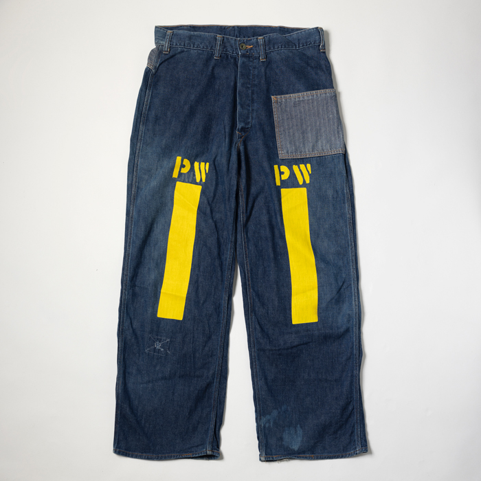 『ヘイルメリーマガジン』にて、筆者が度々メインカットで着用したスペシャルメイクアップのワークトラウザースを出品しよう。当該品はPW(囚人のためのワークウエア)をターゲットにした再構築アイテムで、しかし簡易なつくりのヴィンテージ物に比べて、凝りに凝った仕様にリデザインされている。ボディはクオリティが高いライトオンスのデニム、ポケットは淡色のクラッシュ・ド・ヘリンボーンで切り替えしている。特筆すべきは、前後にプリントされたPWマークとイエローライン。筆者の周囲にいるアメカジ上級者からも、大絶賛されているワークトラウザースなのだ。筆者も初見のウルトラレアな逸品ゆえ、是非、貴殿のコレクションに加えて頂きたい