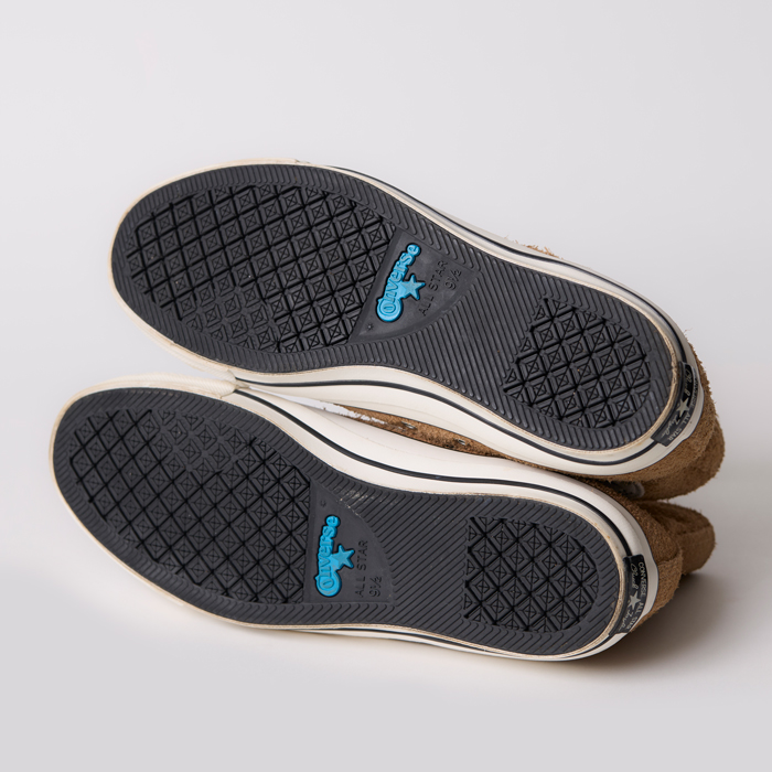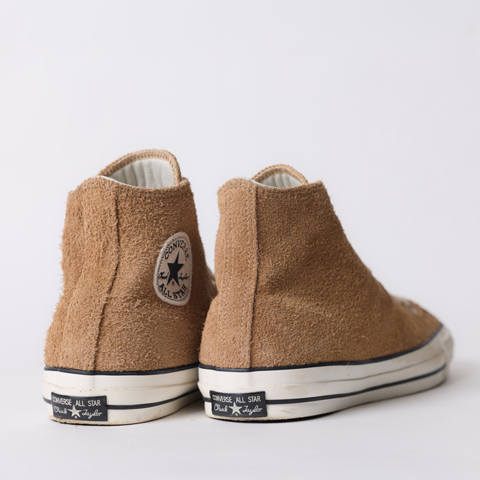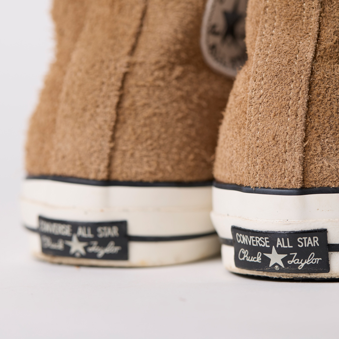 日本企画の『converse』「ALL STAR」及び「Chuck Taylor」を、筆者が愛用するのには理由がある。80年代のアメリカ製オールスターをターゲットにしているからだ。スッキリとしたルックスと『VIBRAM』ラバーソールの履き心地が良いのだ。当該品はその日本企画のオールスターで、ライトブラウンのスエード(リアルレザー)アッパーがダッズ世代にピッタリ!ブラックのヒールパッチには、「Chuck Taylor」の名前が入っている。サイズ9.5インチ(28cm)で、コンディションは新品同様だ