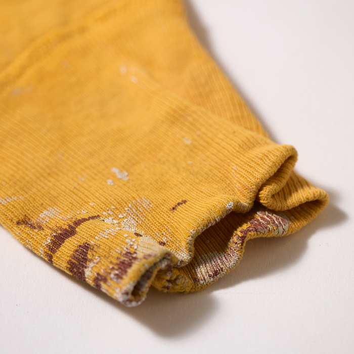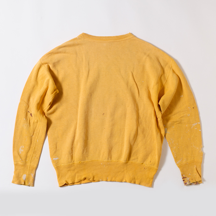 40sに生産された前Vのヴィンテージスウェットシャツを出品しよう。ブランドは米国の名門『RUSSELL ATHLETIC』で、ほつれたタグでヴィンテージの真贋が確認できる。90年代中頃に、筆者が横浜元町にあったヴィンテージショップで発見。当時はリバースウィーブよりも、セットインのヴィンテージスウェットが高価だった時代だ。ペンキの飛び(リアルな飛びなのでクール)はあったが、ほぼデッドストックで購入した。が、あれから30年所有。特に初めの5年は頻繁に着用したので、経年変化及び擦り切れた箇所がある。が、ネックに伸びはなく、雰囲気も抜群だ。数日様子を見て、売れなければコレクションに戻す予定。ゴールドボディ×ブラックプリントもアメリカンだ。タグからサイズ「L」が確認できる
