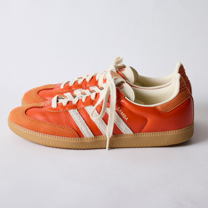 伝説のシューズ(復刻版)を出品しよう。『adidas』サンバの歴史は1950にまで遡る。本国ドイツでの凍ったサッカーピッチの使用を目的に開発された。その後ブラジルワールドカップでのプロモーションで、氷上での高いパフォーマンスに由来して、サンバというモデル名が冠された。その後多くのミュージシャンやアーチストから愛用されて、ファッションシーンの人気者になった。当該品はその復刻版で、その中でもオレンジの個体は3万円超えのプレミアム価格になっている。サイズ28.5cmでミントコンディションだ