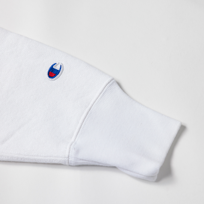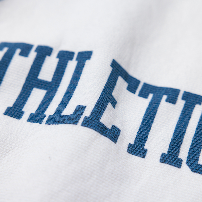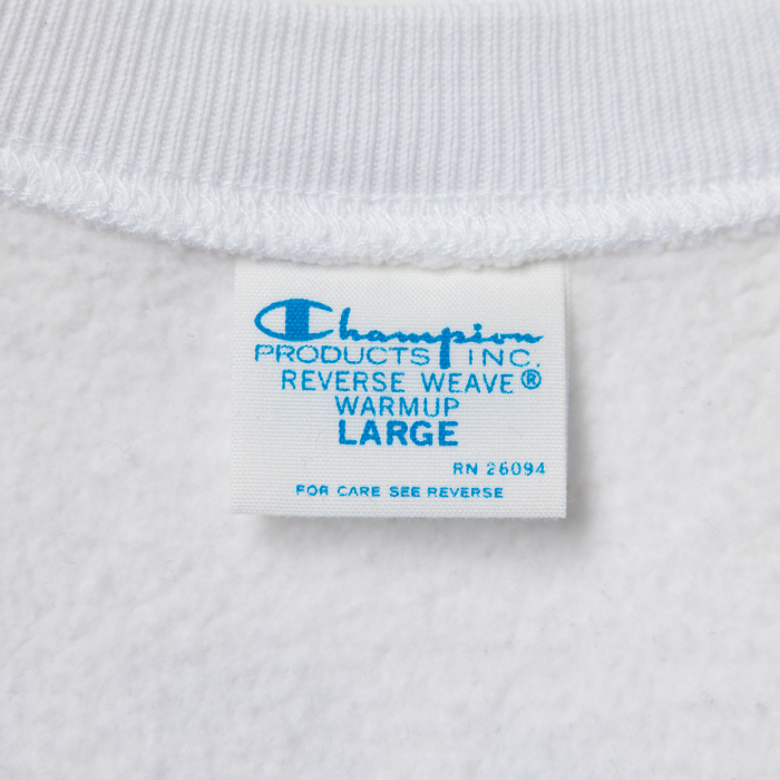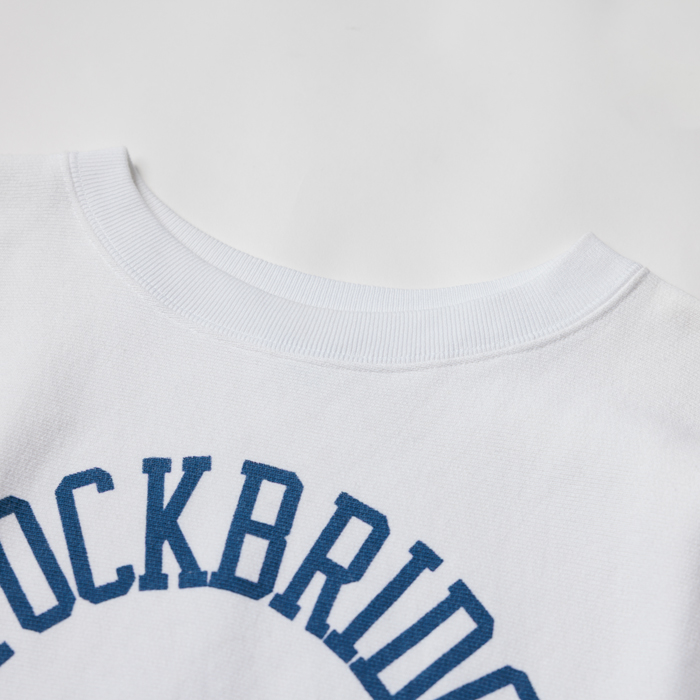 アメカジコーデの話だ。インディゴやオリーブや杢グレーばかりではなく、アメカジにも季節にフィットするカラーが必要だと思っている。よって春から夏に掛けてのスウェットシャツに、オフホワイトという爽やかなカラーを推奨したい。当該品は青の単色タグが付く復刻版『champion』リバースウィーブで、オフホワイトボディのクルーネック仕様だ。胸にはブルーの染み込みプリントで、「STOCK BRIDGE ATHLETIC」と入っている。真っ青なジーンズに合わせたい。サイズ「L」でミントコンディションだ