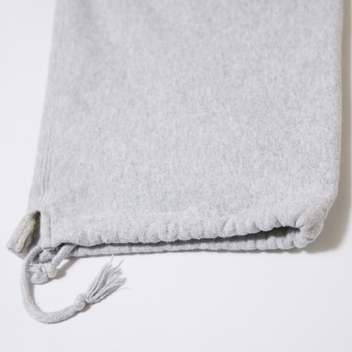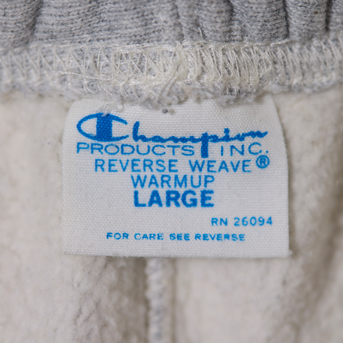 『ヘイルメリーマガジン』のファッション特集で、筆者は度々アメカジコーデにスウェットパンツを提案をしている。筆者の場合トレーニングにも愛用しているため、杢グレーのスウェットパンツは着用頻度が高い。そんな筆者が、先を見越してストックしているお気に入りを出品しよう。当該品は青の単色タグが付く杢グレーの復刻版『champion』リバースウィーブで、裾にコードが付くクラシックタイプのスウェットパンツだ。“インディアンズ”のワッペンは筆者の後付け。ミントコンディションだ