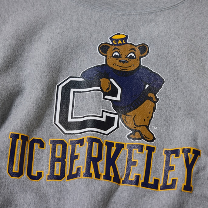 筆者が大学時代、カリフォルニア大学バークレー校は世界の大学生から憧憬される存在だった。世界の大学ランキングで常にシングル順位、その上スポーツも強い文武両道の大学だったからだ。当該品は赤の単色タグが付く杢グレーのリバースウィーブで、アメリカ製のクルーネック仕様。胸には同大学のキャラクターと「BERKELEY」のレターが大きくプリントされている。当時、バークレーの街並みとこの「calベア」キャラクターに憧れていたことを思い出す。撮影のみに使用のミントコンディション