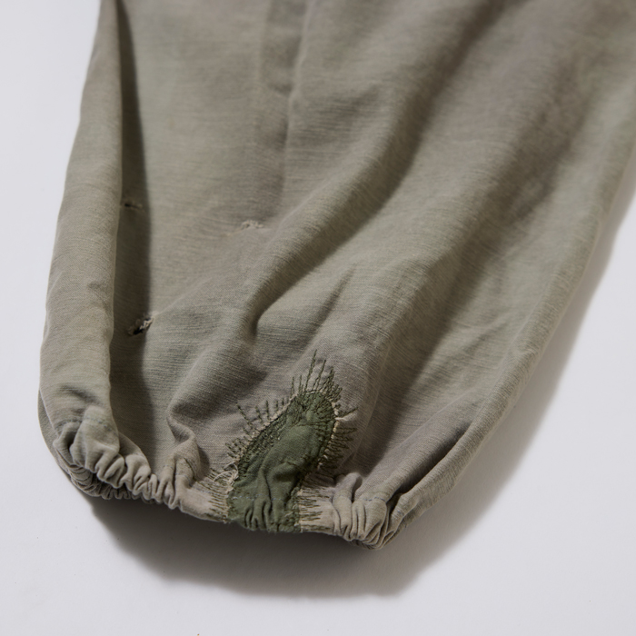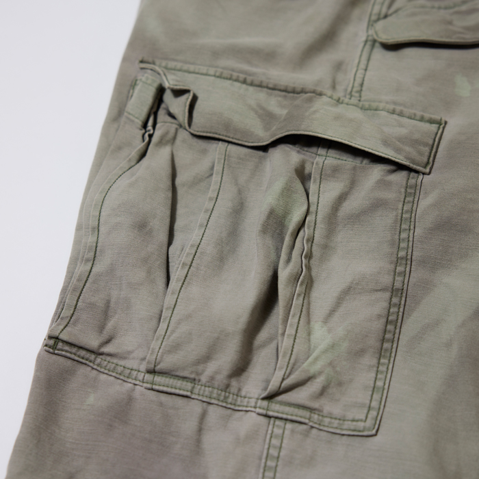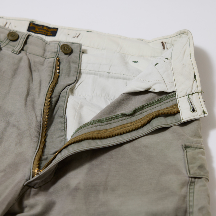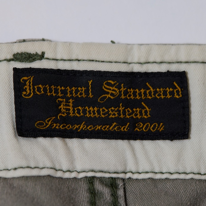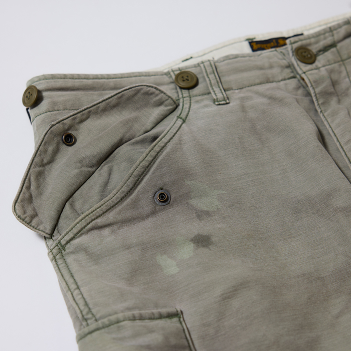 まるで全盛期の『RRL』を彷彿とさせる雰囲気最高なカーゴパンツを出品しよう。当該品は、ジャーナルスタンダード傘下のワーク系ブランド『J.S. Homestead』からリリースされたオリーブカラーのカーゴパンツ。ハードめな褪色加工やダメージ加工が施されており、そのラギッドな加工が太めのシルエットにフィットしている。筆者のお気に入りで、裾のゴム仕様は筆者のセルフカスタム。サイズ「M」だが「L」相当。ヴィンテージ或いはエイジング加工愛好者にお勧め。ミントコンディションだ