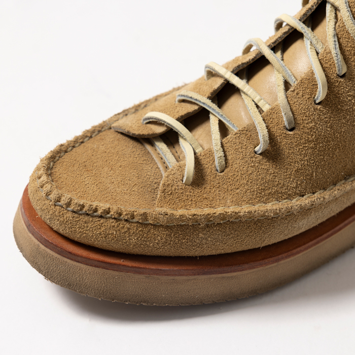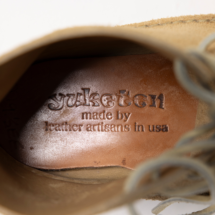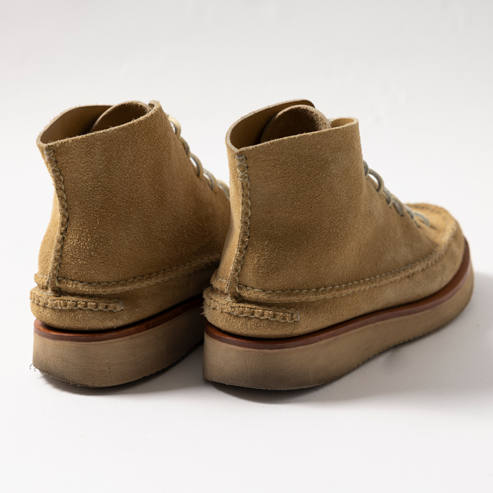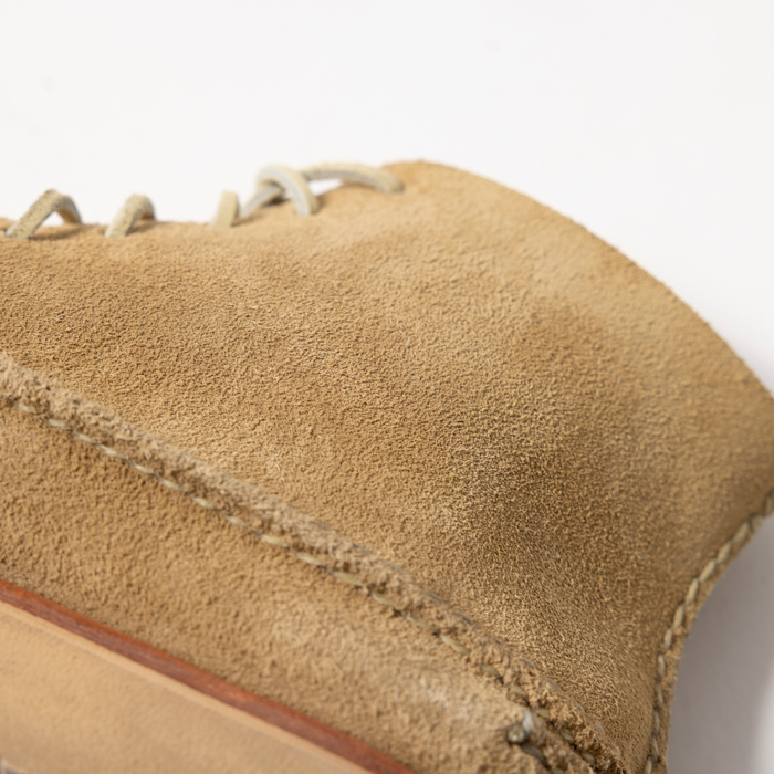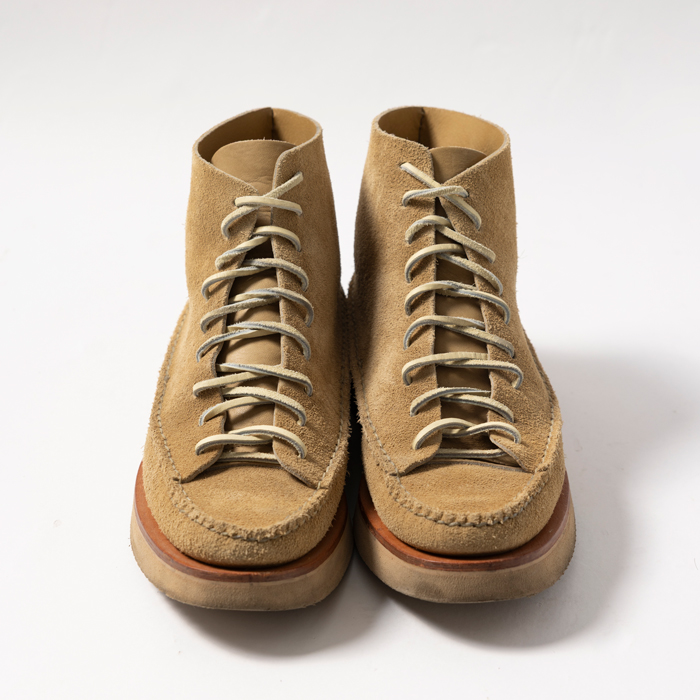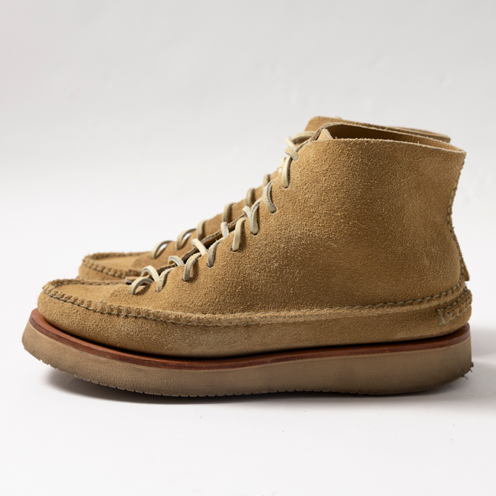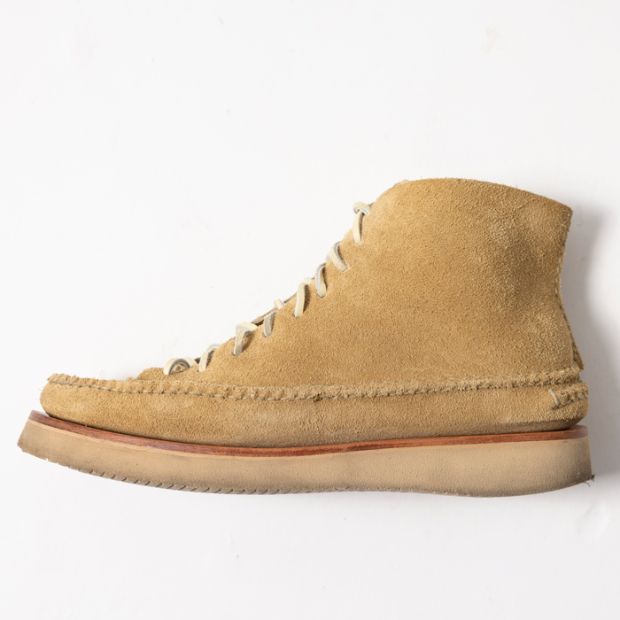 アウトドアスポーツのメッカ、アメリカのメイン州にてトゥルーモカシン製法で作られる『YUKETEN』のモカシンブーツ。筆者が長く愛用するブーツブランドだ。当該品はオールハンドソーンの「スニーカーモックハイ」で、70sのスニーカーがデザインソースになっているモカシンブーツだ。ボディにはホーウィン社のフレッシュアウトレザーを採用、アウトソールは『Vibram』 #2021 が装着されているのでソフトな履き心地がウリ。クルマの運転もOKなミントコンディション物だ