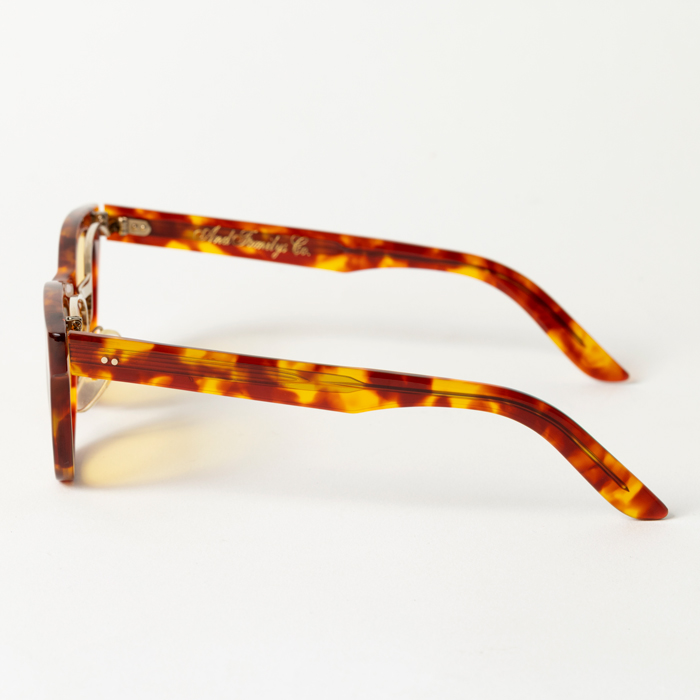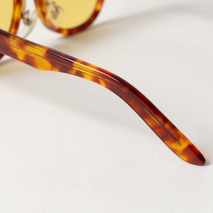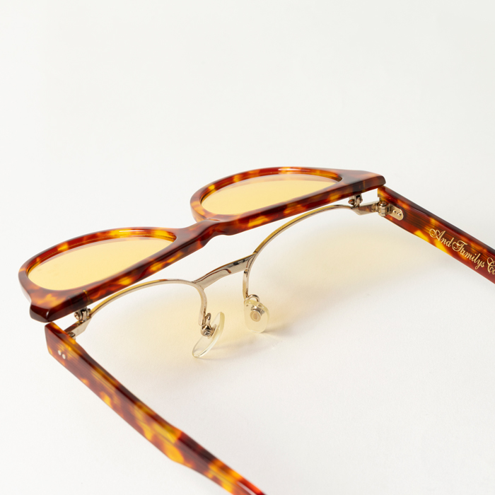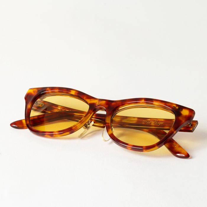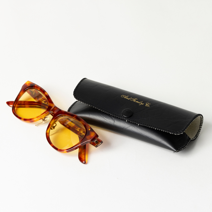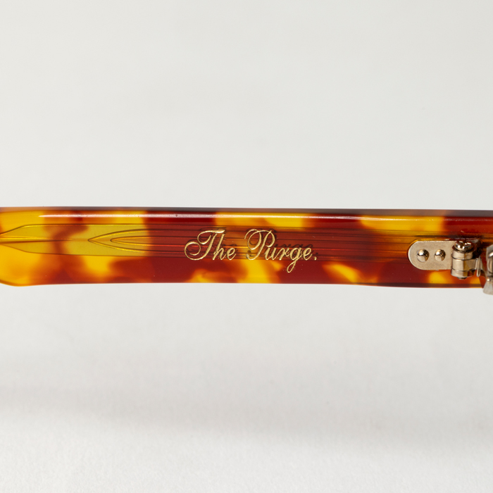 ギア仕様の眼鏡フレームが好きだ。ギア仕様とはパイロットが愛用する『RAYBAN』のAVIATORモデルだったり、歴史に残る文豪たちが着用したフィリップアップ仕様フレームを指す。当該品は『AND FAMILYS』がリリースしたフリップアップ型サングラスで、セルロイドの鼈甲パターンフレームとカリクロームのイエローレンズというフル装備な仕様が特徴だ。モデル名には「THE PURGE」と冠され、元上代は3万6000円だった。ブラックの専用ケース付きのミントコンディションだ