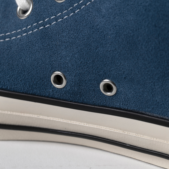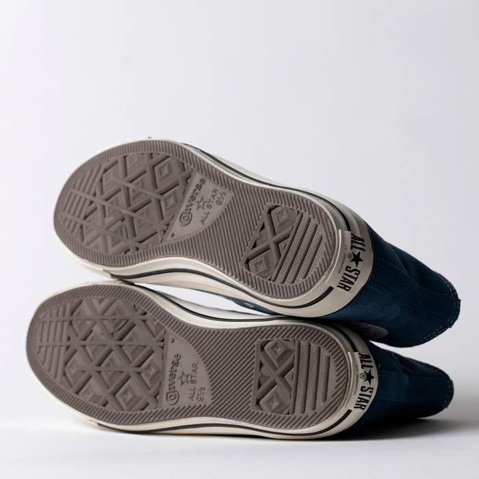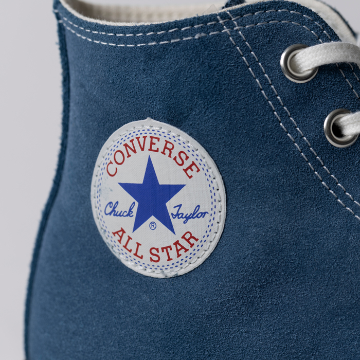 『CONVERSE』の何を選ぶか?について話をしよう。多くのアメカジ愛好家が、アメリカ企画の「CT70」を支持している。が、筆者は日本企画の「ALLSTAR」もターゲットに入っている。それはルックスが、上記した80sアメリカ製に酷似しているからだ。当該品はその日本企画の「ALLSTAR」で、ブルーのリアルレザー(スエード)を配したハイカット仕様。よって、ジーンズ、ホワイトデニム、チノーズなどにフィットする。元上代は¥1万8000円オーバーで、ミントコンディション