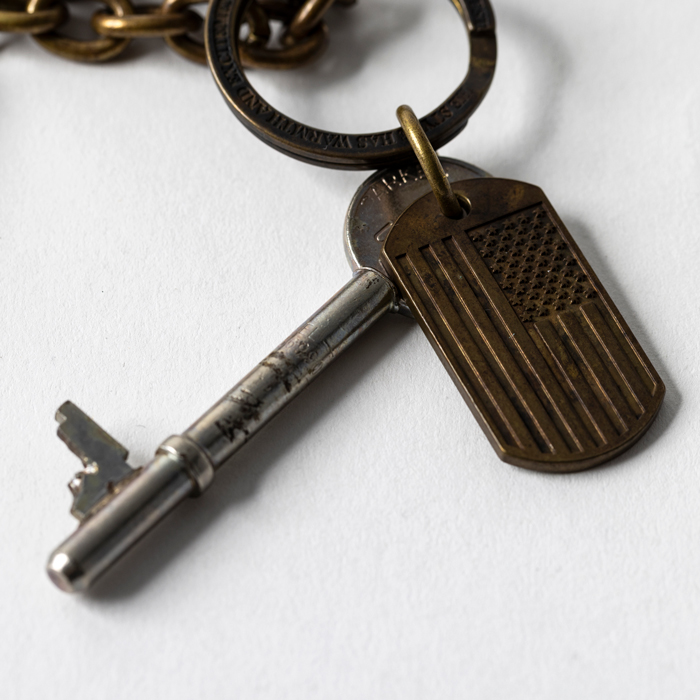 筆者のキーホルダー好きは『ヘイルメリーマガジン』の誌面でも有名だ。先般自身のインスタにポストしたキーホルダーコレクションには、35万回を超える閲覧があったほどだ。今日はコレクションの中から、とっておきのラギッドバージョンを出品する。当該品はブランド不詳のキーフックで、素材はブラスで統一されている。ゴツいフックとシューホーンがワイルドで、そこにヴィンテージのキーがアレンジされている。筆者も幾つか後付けをしている。エイジング物でミントコンディションだ
