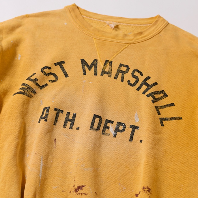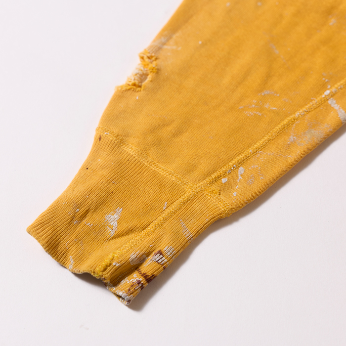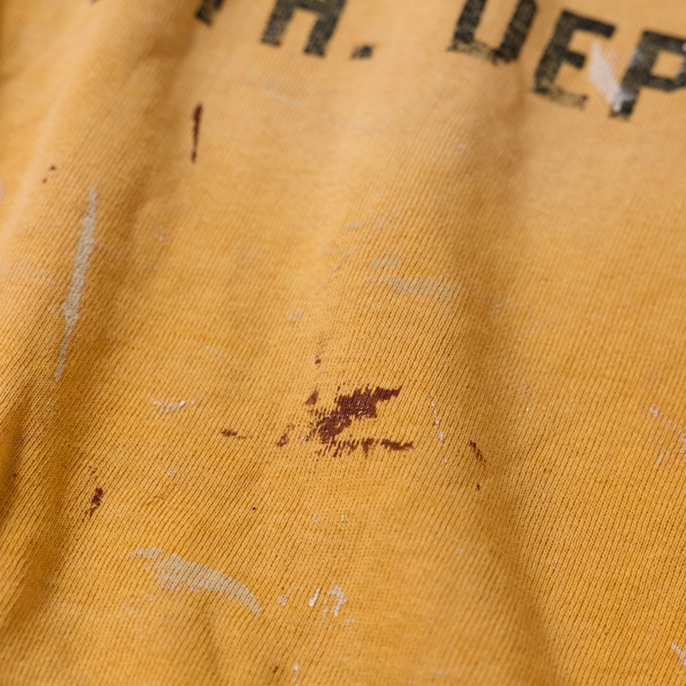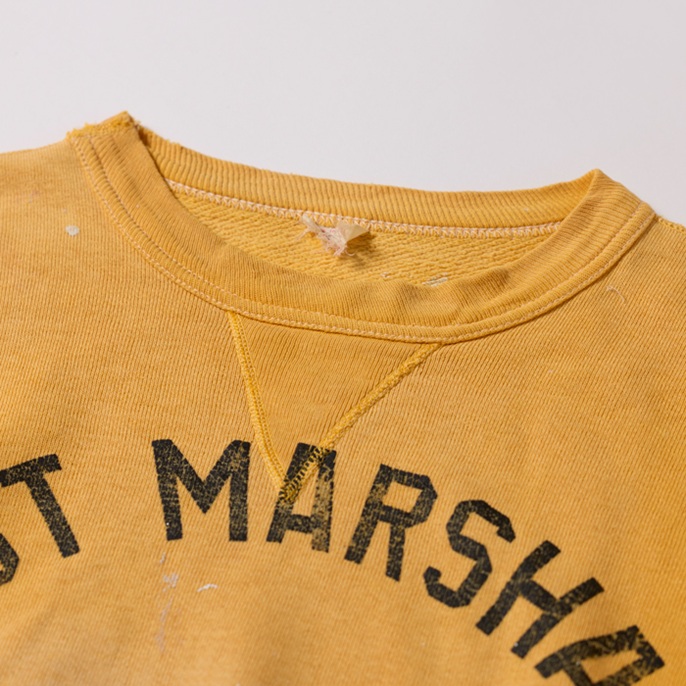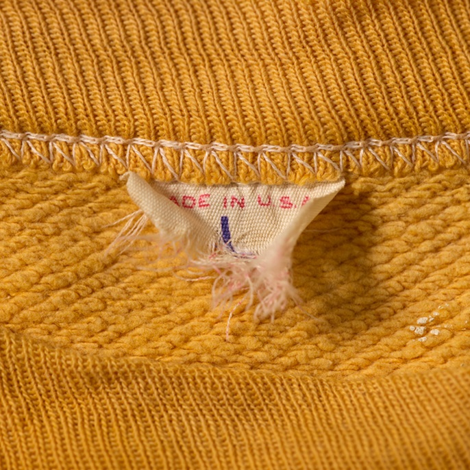 40sに生産された前Vのヴィンテージスウェットシャツを出品しよう。ブランドは米国の名門『RUSSELL ATHLETIC』で、ほつれたタグでヴィンテージの真贋が確認できる。90年代中頃に、筆者が横浜元町にあったヴィンテージショップで発見。当時はリバースウィーブよりも、セットインのヴィンテージスウェットが高価だった時代だ。ペンキの飛び(リアルな飛びなのでクール)はあったが、ほぼデッドストックで購入した。が、あれから30年所有。特に初めの5年は頻繁に着用したので、経年変化及び擦り切れた箇所がある。が、ネックに伸びはなく、雰囲気も抜群だ。数日様子を見て、売れなければコレクションに戻す予定。ゴールドボディ×ブラックプリントもアメリカンだ。タグからサイズ「L」が確認できる