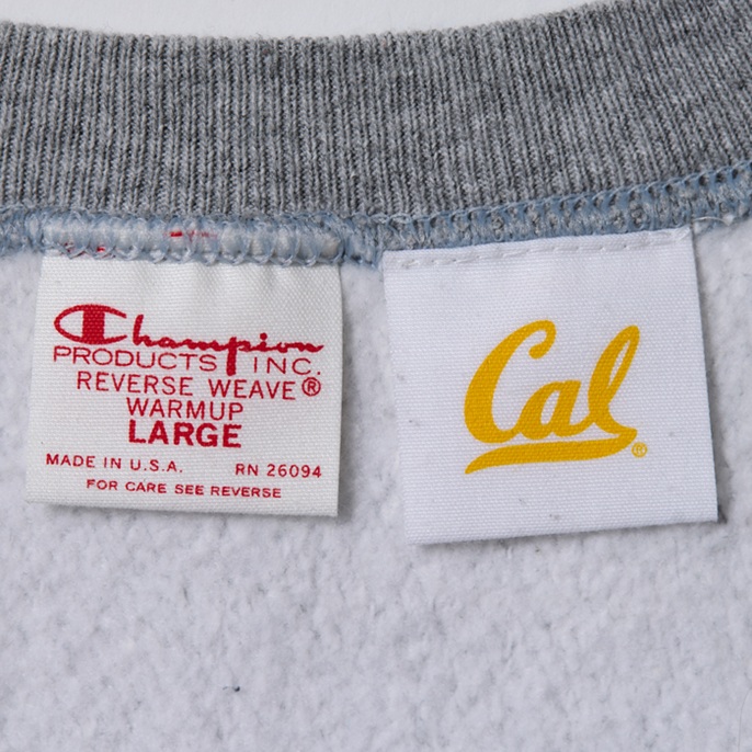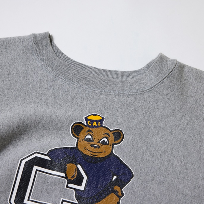 筆者が大学時代、カリフォルニア大学バークレー校は世界の大学生から憧憬される存在だった。世界の大学ランキングで常にシングル順位、その上スポーツも強い文武両道の大学だったからだ。当該品は赤の単色タグが付く杢グレーのリバースウィーブで、アメリカ製のクルーネック仕様。胸には同大学のキャラクターと「BERKELEY」のレターが大きくプリントされている。当時、バークレーの街並みとこの「calベア」キャラクターに憧れていたことを思い出す。撮影のみに使用のミントコンディション