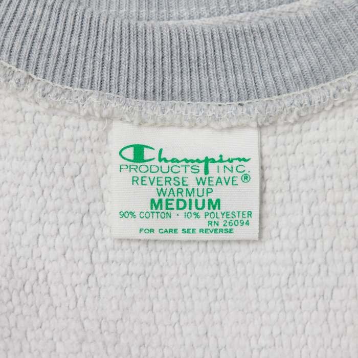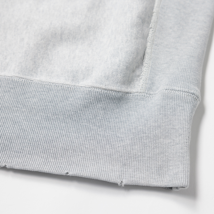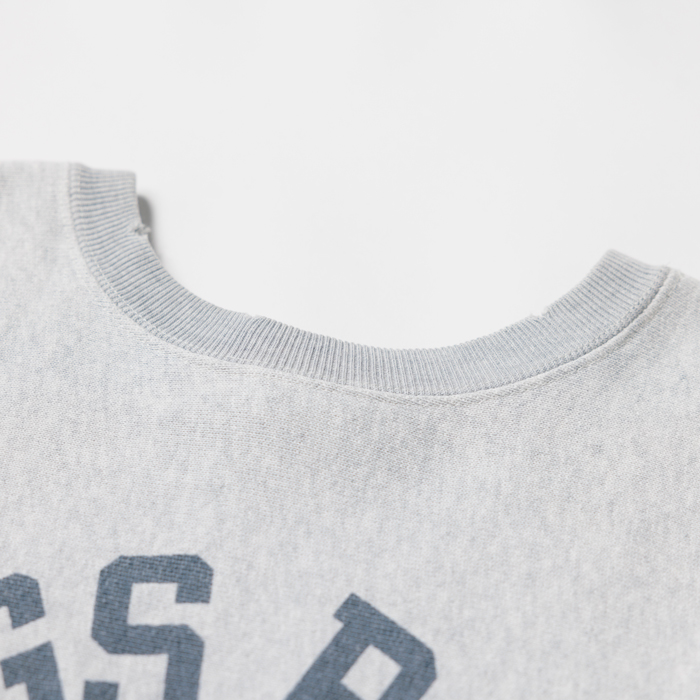 胸の『KINGS POINT』とはニューヨーク州キングスポイントにあるサービスアカデミーで、士官候補生を育成して米国商船隊、海軍の各支部、官民の輸送船などに配置する役割を持つ。当該品は緑の単色タグが付く復刻版『champion』 リバースウィーブで、杢グレーのクルーネック仕様だ。人気のミリタリースウェットゆえ、ヴィンテージに続き復刻版も価格が急騰している。リブ(袖、ネック)には、雰囲気がある経年変化加工が施されている。サイズ「M」だが「L」に相当。ミントコンディションだ