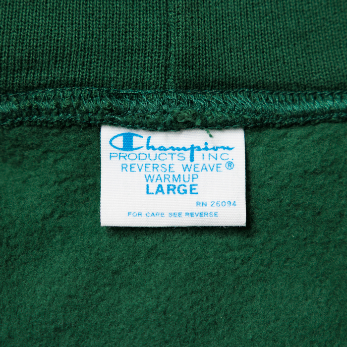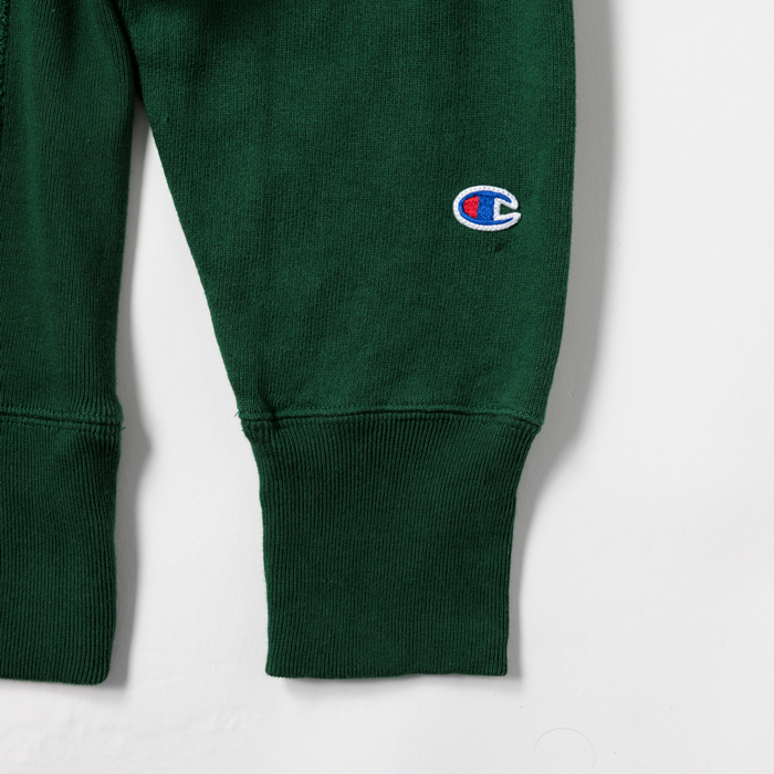 2025年10月号のワイドレシーバーズリポートで、筆者は生涯スウェットシャツが似合うベテランダッズを目指すと宣言した。そして沢山の読者諸兄姉がこれに賛同してくれた。よって、我々世代が似合うスウェットシャツを出品したい。当該品は『champion』がリリースしたフォレストグリーンのhoodieで、青の単色タグが付く復刻版の「L」サイズだ。胸にはホワイト3段のアスレチック系のクールなプリント(ラバープリント)が入っている。撮影に使用しただけのミントコンディション物