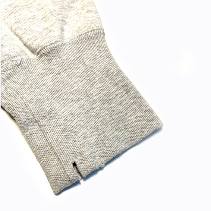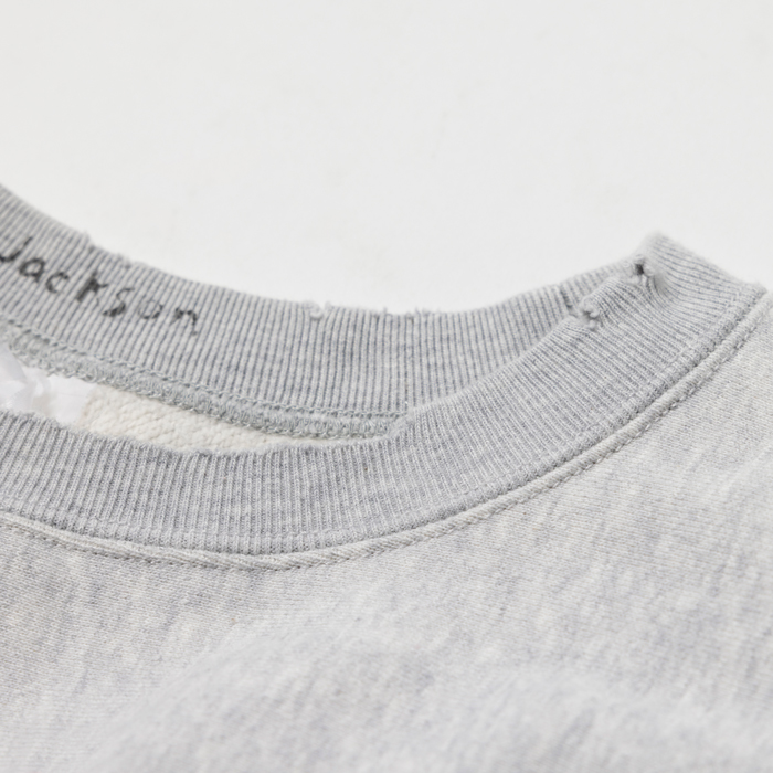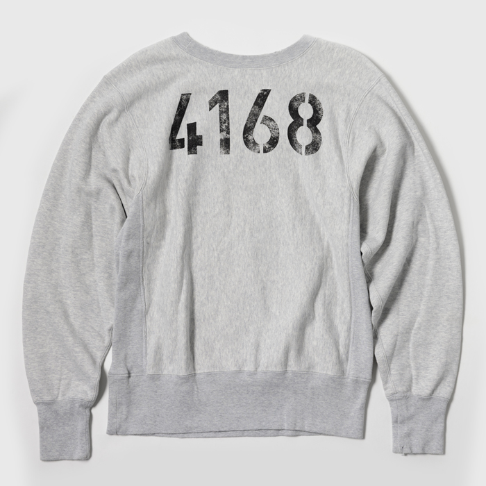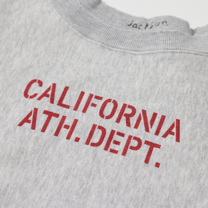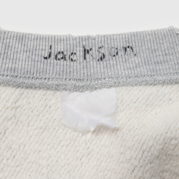 『ヘイルメリーマガジン』でも筆者のお気に入りスウェットシャツとして、しばしば登場する『Jackson Mattisse』。特にリバースウィーブ型を愛用している。その理由は高い製品クオリティと、ヴィンテージライクなデザイン及び加工だ。時にそれが、リアルヴィンテージを超越する。当該品はそんなヴィンテージ超えのリバース型で、杢グレーのクルーネック仕様。前面のアスレ系染み込みプリントと、後面の大きなナンバーがカレッジ好きを刺激した。軽い加工ありでミントコンディション
