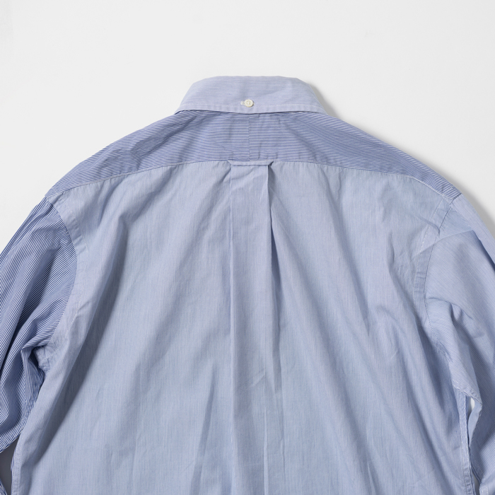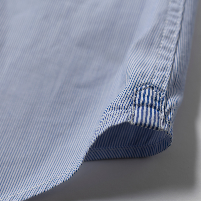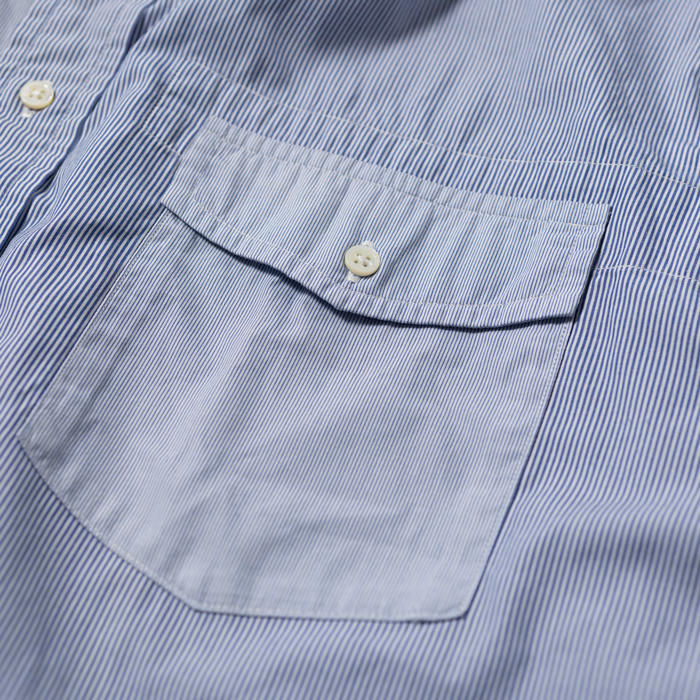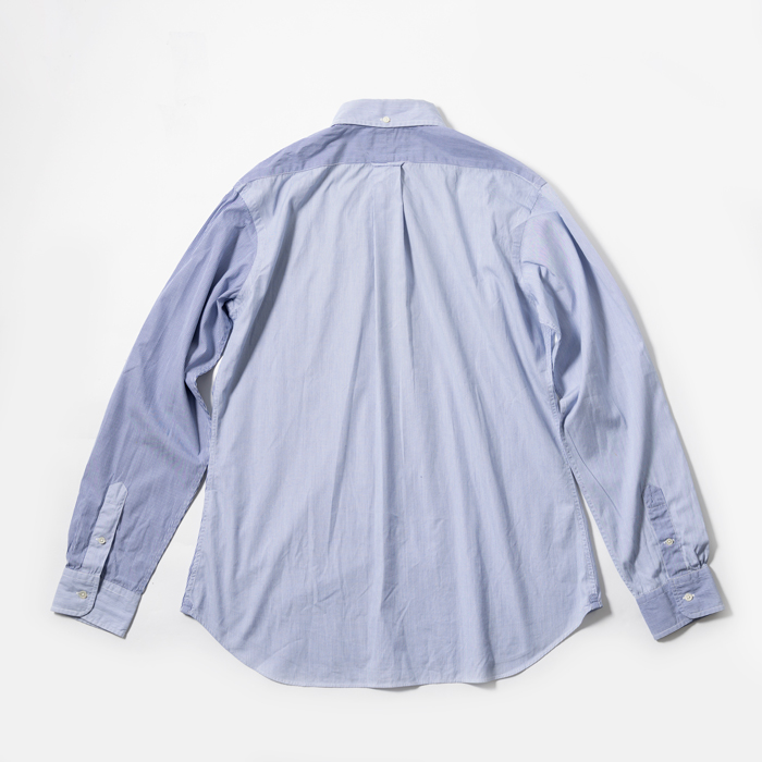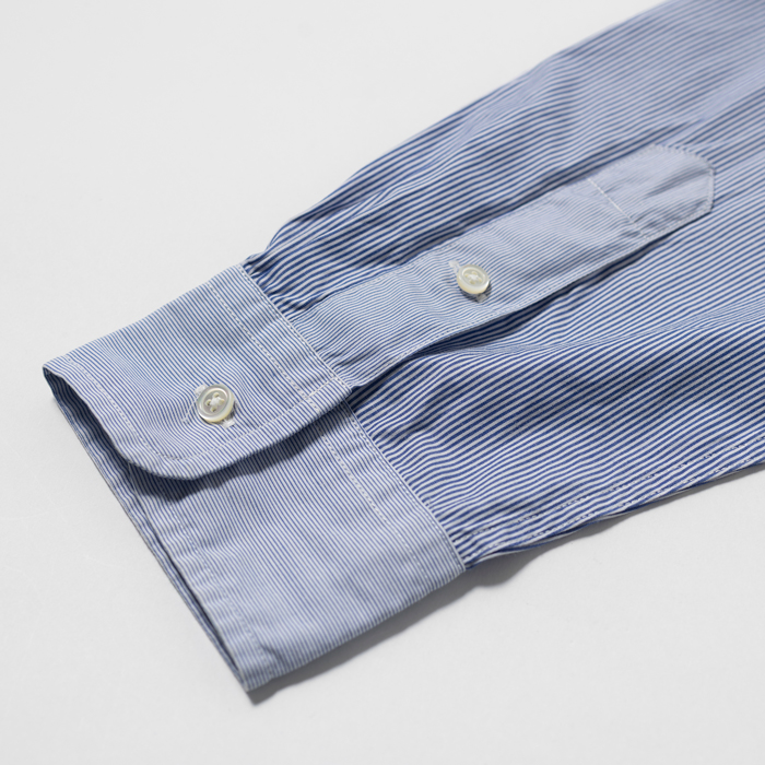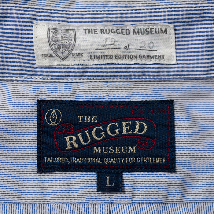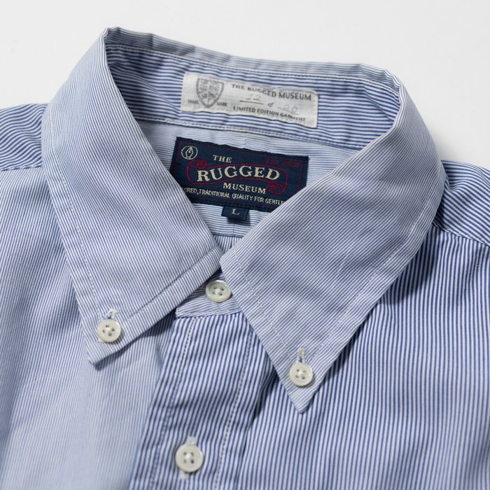 似て非なるものは相性が悪い。アメカジとアイビーは、この関係にある。が、ボタンダウンシャツだけは別だ。筆者の世代でも2回り年下の世代でも、『ブルックスブラザーズ』のボタンダウンシャツを愛用している。古着屋でも、相変わらずこのシャツは高価だ。当該品は筆者が館長を務めた『THE RUGGED MUSEUM』のボタンダウンシャツで、『ブルックスブラザーズ』の型紙を踏襲している。ピッチが違う2種のピンストライプを、左右非対称に組み合わせたこだわりのデザインだ。素材は打ち込みの良いブロードでコットン100%。サイズLでミントコンディションだ