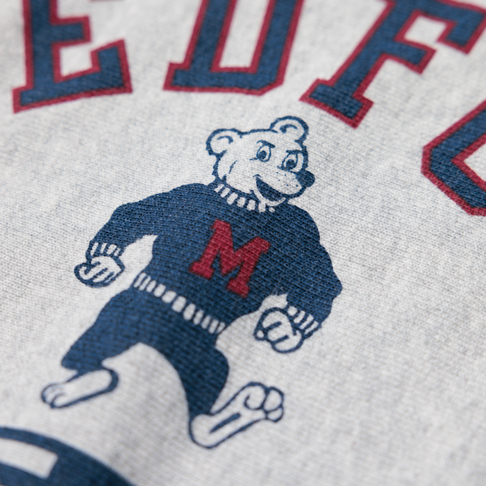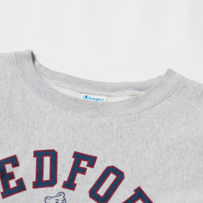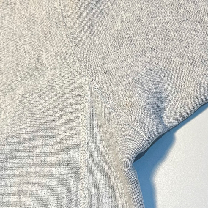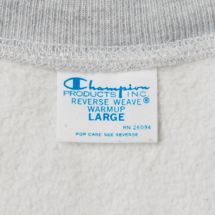 リバースウィーブ購入には悩みが付き物だ。❶本物のヴィンテージ❷本家の復刻版❸アメカジブランドのレプリカという購入時の選択だ。筆者のストックは、❶と❷を中心に構成されている。その中から、グッドなプリント物を出品する。当該品は青の単色タグが付く復刻版の『champion』リバースウィーブで、杢グレーボディのクルーネック仕様だ。特筆すべきはクールな4段のプリント。ポップなチームキャラクターと抜き番がセットで入るグッドデザインで、ミントコンディション物だ