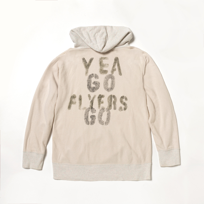 『ヘイルメリーマガジン』及び筆者のインスタから、幾度も露出しているこだわりのフーディーを出品する。当該品は『DENIM DUNGAREE』がリリースしたスウェットパーカで、前後のアメリカンなプリントに惹かれて購入した思い出の一着。ボディはコットン100%のアイボリーで、前面にはフリスビー系のフロッキープリントが星条旗カラーで入っている。後面には、ステンシルペイントがハンドメイドっぽく印字されるこだわりよう。洗い加工でヴィンテージ感あるも、グッドコンディションだ