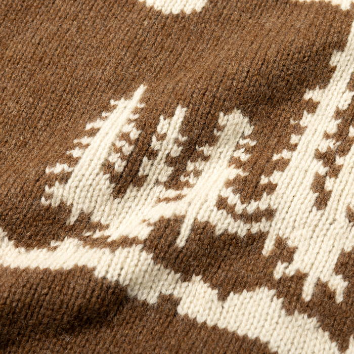 筆者は強く推しているが、ここにきてやっと『BEAMS PLUS』や『J.S. Homestead』の評価が高くなっている。実のところ、インナーやトラウザースはアメカジハイブランドより優れているアイテムが多い。当該品は『BEAMS PLUS』がリリースしたアウトドア系セーターで、ミドルゲージのニットを用いて鳥や森の風景が編み込まれている。ボディは肉厚で、ウール100%なのが嬉しい。落ち着いたブラウンカラーゆえ、ウールパンツ、チノーズ、ジーンズと相性良し。ミントコンディションだ