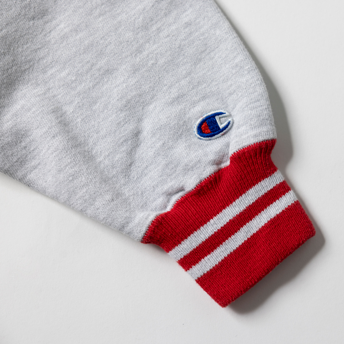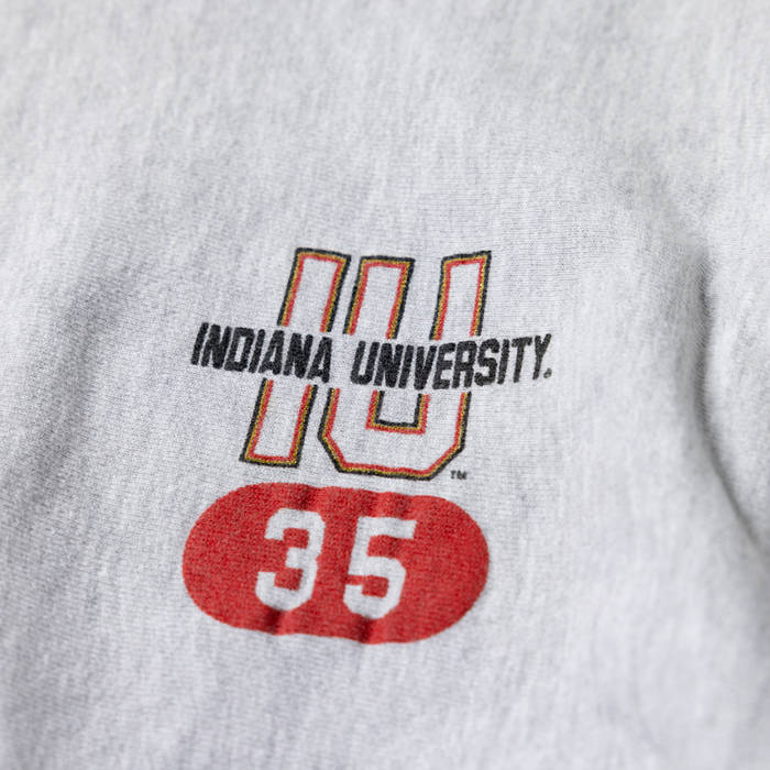 筆者がコレクションしているヴィンテージの『champion』 リバースウィーブを出品しよう。当該品は刺繍のトリコロールタグが付く80年代のヴィンテージピースで、杢グレーボディの各リブにスクールカラーのレッドがセッティングされるスペシャルメイクアップモデルだ。胸には、名門州立大「INDIANA UNIVERSITY」のアイコン& レターが入っている。挿し色でレッドが入るのでジーンズとの相性は抜群だ。着用回数が少ないミントコンディション物ゆえ、貴殿のコレクションに加えて頂きたい
