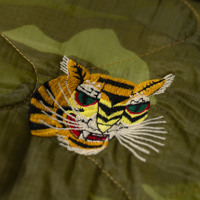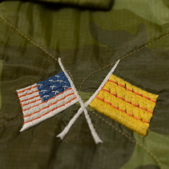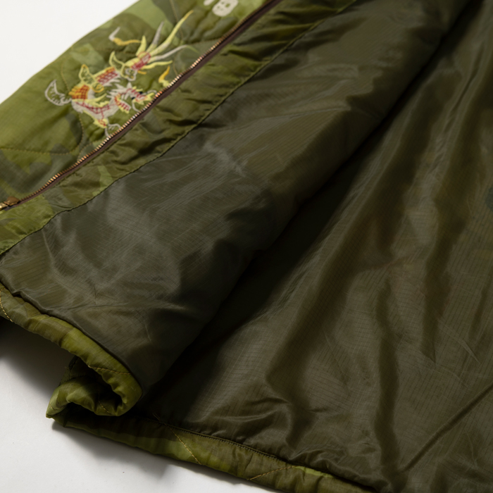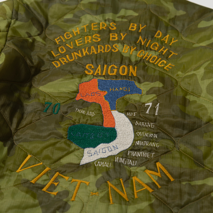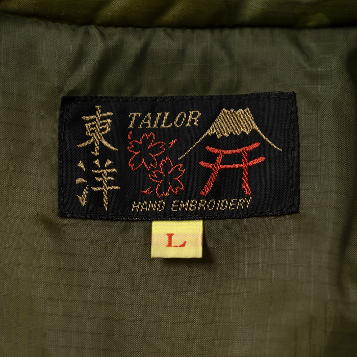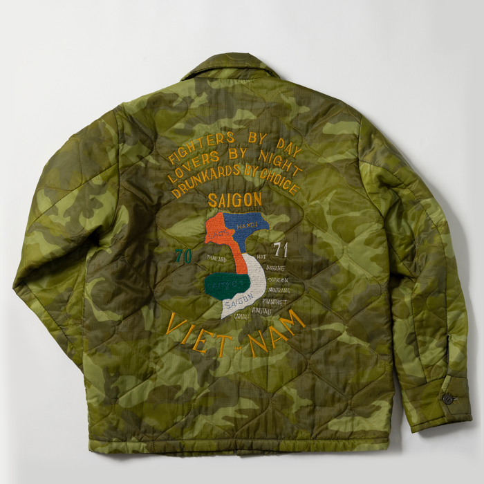 近年、アメカジ上級者に愛用されるようになった東洋の“ベトジャン”を出品する。当該品は東洋エンタープライズの“マニアックライン”『TAILOR TOYO』がリリースしたナイロンキルトのベトジャンで、オリジナルのカムフラージュ柄とベトナム流のヘタウマ刺繍がウリだ。カラフルな刺繍は、前後左右にフルデコ状態で入っている。中綿入りなので、裏ネルのコーチJKTより暖かいのが嬉しい。ボトムスは、ジーンズ或いは軍パン系がフィット。肩に若干ほつれあるがミントコンディションだ