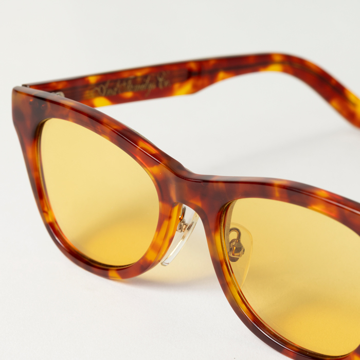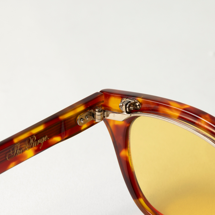 ギア仕様の眼鏡フレームが好きだ。ギア仕様とはパイロットが愛用する『RAYBAN』のAVIATORモデルだったり、歴史に残る文豪たちが着用したフィリップアップ仕様フレームを指す。当該品は『AND FAMILYS』がリリースしたフリップアップ型サングラスで、セルロイドの鼈甲パターンフレームとカリクロームのイエローレンズというフル装備な仕様が特徴だ。モデル名には「THE PURGE」と冠され、元上代は3万6000円だった。ブラックの専用ケース付きのミントコンディションだ