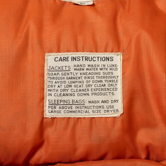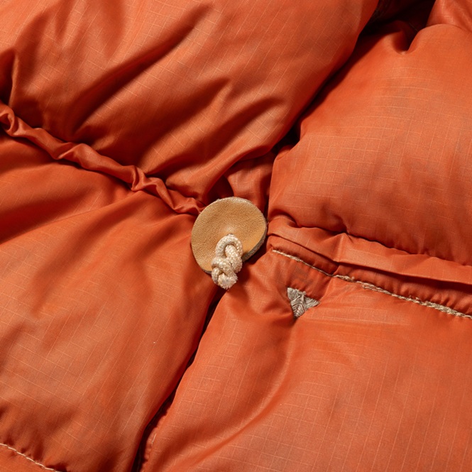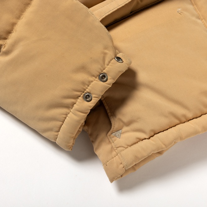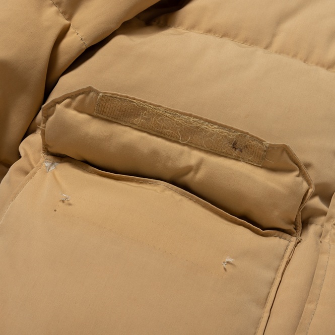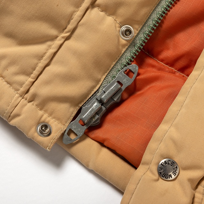 正規代理店の品質表記タグが付かない70s後半に輸入された『THE NORTH FACE』のダウンJKT。シェルはベージュの60/40 で、インナーはナイロンのレンガ色という当時一番人気だった素材及び配色を持つ。勿論ジップは、『TALON』のゴツい硬質プラスチック製(グレー)が装着される。スカイライナーやカラコラムのクラシックなダウンJKTも良いが、大学時代にリアルタイムで着用した当該品は外せないマスターピースだ。当時フードは別売りだった。ミントコンディションだ