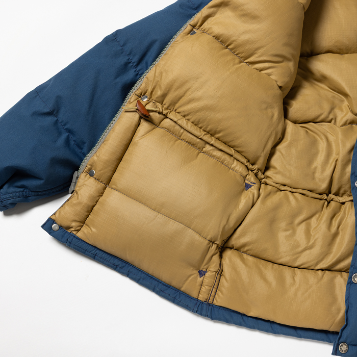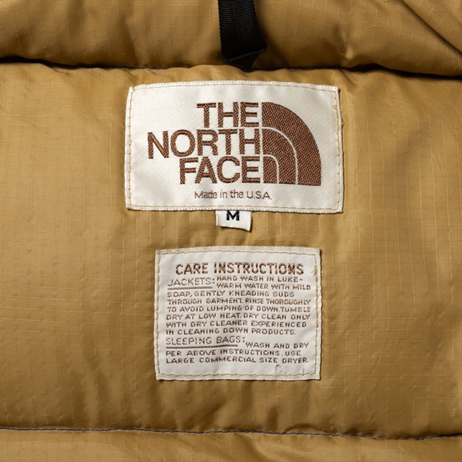 通称“茶タグ” が付くヴィンテージピースの銘品ダウンJKTを出品しよう。当該品は、正規代理店の品質表記タグが付かない『THE NORTH FACE』のダウンJKTで、70s後半に生産されたヴィンテージの「MADE IN U.S.A.」物だ。シェルはブルーの65/35 で、インナーはベージュのナイロンというヘビーデュティーな素材と配色を持つ。そしてジップには『TALON』製のゴツい硬質プラスチック製(グレー)が装着される。スカイライナーやカラコラムのクラシックなダウンJKTも良いが、大学時代にリアルタイムで着用した“永遠の定番”は外せないマスターピースだ。現在、コンディションの良いヴィンテージピースには驚きのプライスが付けられている。当時フードは別売りだった。希少な「M」サイズで、ミントコンディションだ