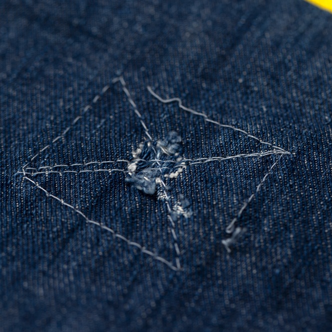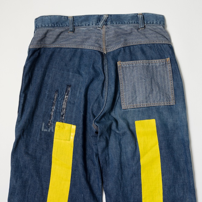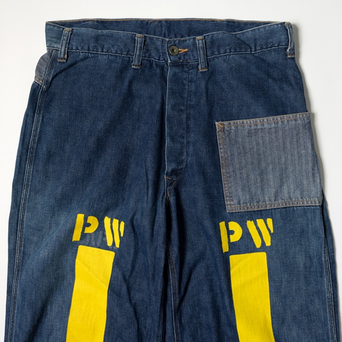 『ヘイルメリーマガジン』にて、筆者が度々メインカットで着用したスペシャルメイクアップのワークトラウザースを出品しよう。当該品はPW(囚人のためのワークウエア)をターゲットにした再構築アイテムで、しかし簡易なつくりのヴィンテージ物に比べて、凝りに凝った仕様にリデザインされている。ボディはクオリティが高いライトオンスのデニム、ポケットは淡色のクラッシュ・ド・ヘリンボーンで切り替えしている。特筆すべきは、前後にプリントされたPWマークとイエローライン。筆者の周囲にいるアメカジ上級者からも、大絶賛されているワークトラウザースなのだ。筆者も初見のウルトラレアな逸品ゆえ、是非、貴殿のコレクションに加えて頂きたい