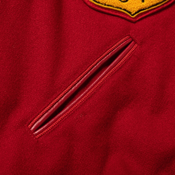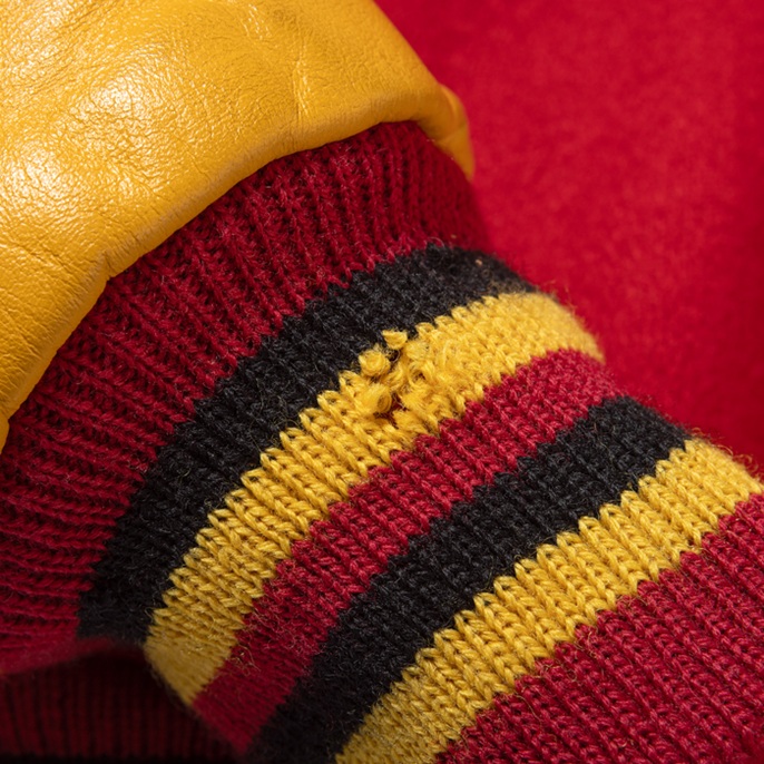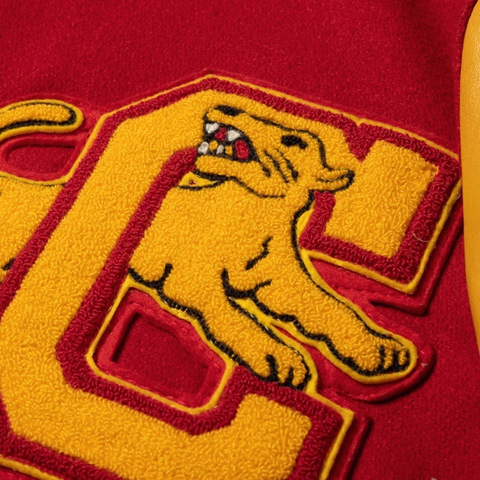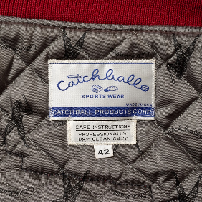 元アメフト選手でアメカジ愛好家ゆえ、スタジャンの真贋にはうるさい。今回は本物中の本物を出品しよう。アメリカの地域チーム或いはクラブチームがオーダーしたフルデコレーション仕様のスタジャンだ。当該品は『Catch Ball」のフルデコ物で、コークレッドのメルトンボディ×マスタードのレザーアームという組み合わせ。特筆すべきは前面、後面、右袖左袖に貼られているビッグキャット種のシニールだ。それはチーム名「Mountain Lions」のアイコンだ。表記はないが、アメリカンフットボールのチームジャケットだと推察する。加えてこの個体は、デッドストック級のコンディションを誇っている。右袖のリブに1箇所穴あきはあるが、恐らく筆者が撮影に着用しただけだと思われる。是非、貴殿のコレクションに加えて頂きたい