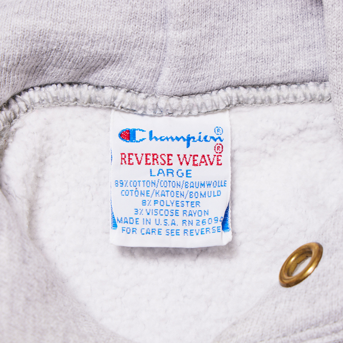 この3~4年、リバースウィーブのヴィンテージピースが高値安定を続けている。然らば、筆者のコレクションからレアな極上物を出品しよう。当該品は『champion』のリバースウィーブパーカで、80年代にリリースされたヴィンテージ物だ。その証として刺繍のトリコタグが付けられている。筆者のお気に入りポイントは「POINT SEBAGO」のラバープリントと↑マーク。ミリタリーライクだが、ここはアメリカ有数のスポーツ施設だ。杢グレーの「MADE IN U.S.A.」物だ